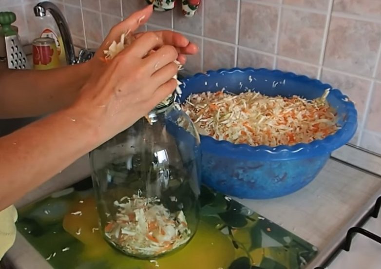 - После приготовления капусту плотно утрамбовывают и прижимают чем-то тяжелым. Это нужно делать для того, чтобы капустка пустила сок. Если на следующий день весь продукт не покрылся рассолом, нужно заменить пресс, выбрав что-нибудь потяжелее.