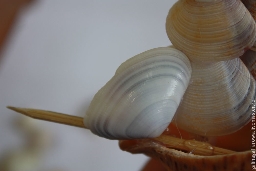 Промажьте зубочистку суперклеем. Посадите на нее ракушки, дайте им время подсохнуть.