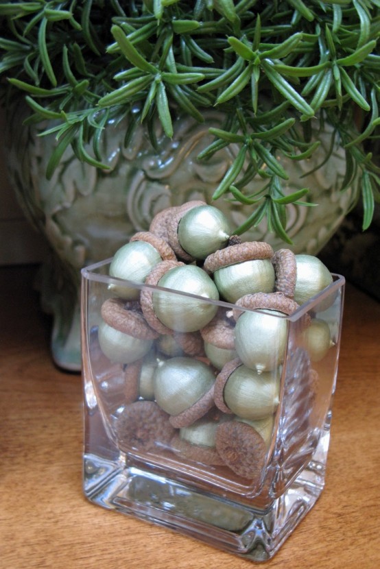 Жёлудь красив сам по себе. Достаточно насыпать желудей в прозрачный сосуд, добавить пару деталей - декор готов!