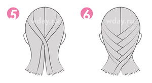 - Те самые оставшиеся локоны необходимо перекрестить между собой на макушке, обязательно расположив их так, чтобы правая из них оказалась сверху;