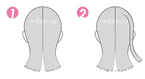 Необходимо разделить волосы на две равные части, не забыв отделить с левой стороны одну прядь, которую потом нужно будет перебросить над основной частью локонов.