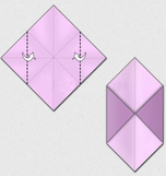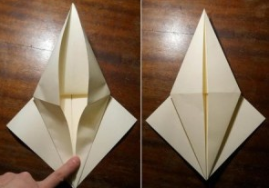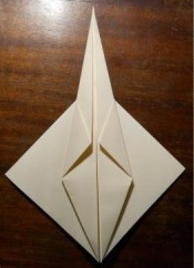 3. Сворачиваем боковые «крылья» ромба, у вас получаются два треугольника, как на картинке. Теперь раскрываем обратно получившиеся треугольники и прячем их внутрь «крыльев» по линиям сгиба схемы.