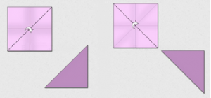 2. Сейчас необходимо сложить оригами, повернув ромбом, сворачиваем треугольник, с левой и с правой сторон есть линии сгибов, их мы помещаем внутрь треугольника и у нас должен получиться ромб.
