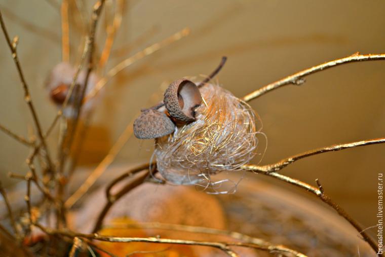 Чтобы дерево выглядело понаряднее, дополняем его шариками из сизаля, украшенными желудями и спрыснутыми золотой краской, чтобы они не слишком выделялись и смотрелись в композиции целостно.