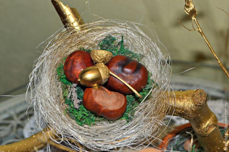 По нашей задумке, в гнезде расположились каштаны и желудь, покрашенный той же золотой краской и приклеенные на клей. Ведь птички уже улетели и яички в гнезде будут выглядеть неправдоподобно. Да и не зря же мы столько бродили по лесу в поиске осенних материалов.