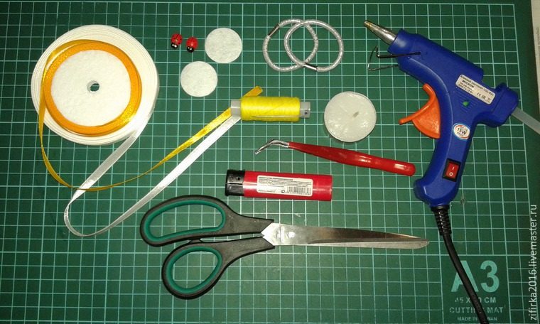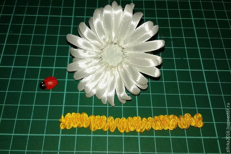 Нам потребуются: — атласная лента шириной 0,5 см белая и желтая; — фетровый кружок диаметром 3 см; — резинка для волос; — зажигалка или свеча; — ножницы; — нитки (под цвет серединки) и иголка; — пинцет; — декоративная божья коровка (не обязательно).