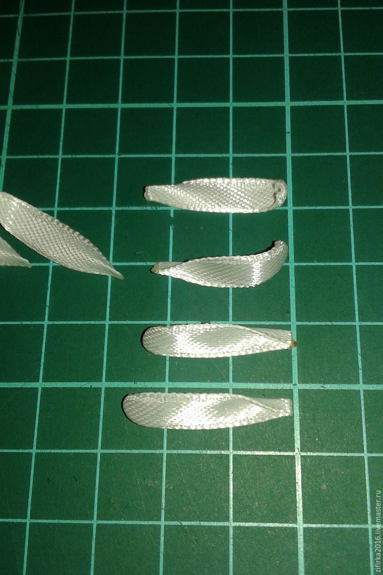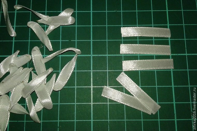1. Делаем лепестки. Для этого нарезаем белую ленту на отрезки по 3 см. На одну ромашку нам потребуется 38 шт.