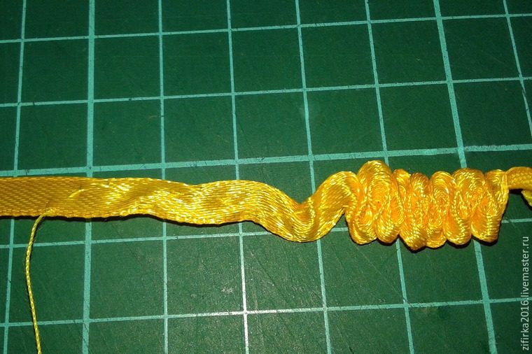 После того, как прошили всю ленту, тянем за свободный конец нитки и сдвигаем ленту к одному краю. Должна получиться заготовка длиной 8-9 см. Нитку закрепляем и обрезаем.