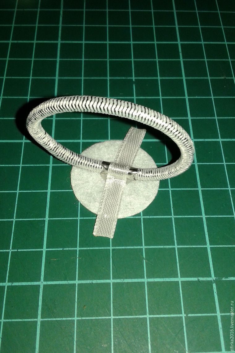 Берем ленточки для нижнего слоя и накладываем одну на другую под углом, фиксируем булавкой. Берем следующую ленту и накладываем на свободный край конструкции также под углом, скалываем. Таким образом формируем пятиугольник.