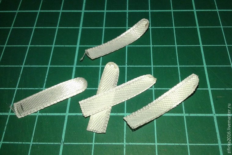 Делать цветочек мы будем двуслойным. Для нижнего слоя нам потребуется 5 кусочков ленточки, а для верхнего 3. Отрезаем отрезки длиной 7-9 см для нижнего слоя и 6-7 см для верхнего. Если сделать кусочки ленты длиннее, то складочек на цветочке будет больше, если кусочки сделать короче, то цветочек будет менее рюшчатым, но будут четче видны округлости лепестков. Опаливаем края ленточек зажигалкой.