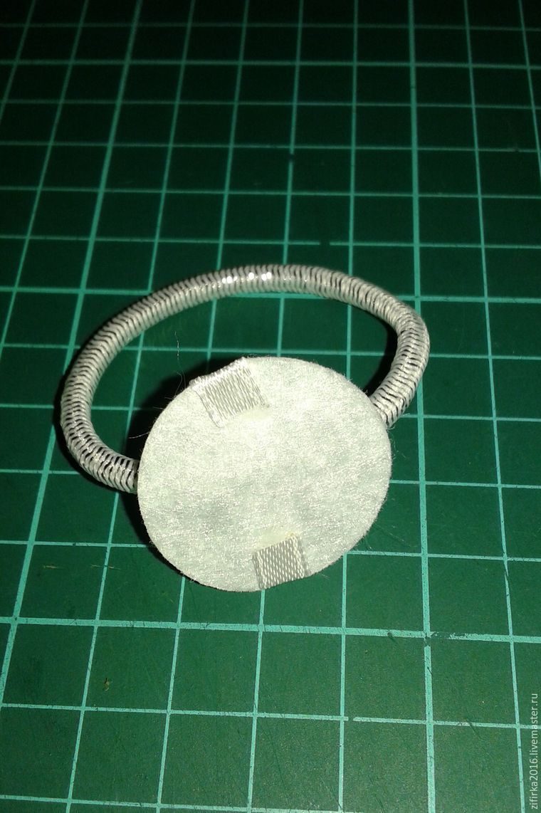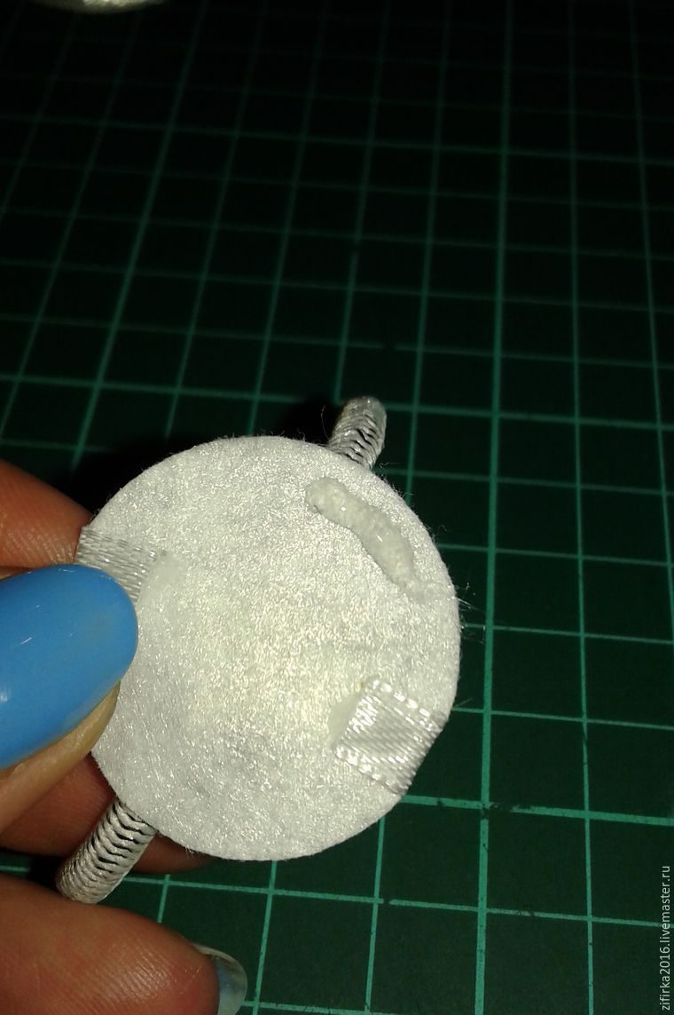 Резинку с полосочкой приклеиваем ко второму красному кругу. И остаётся лишь соединить оба круга – основы вместе.