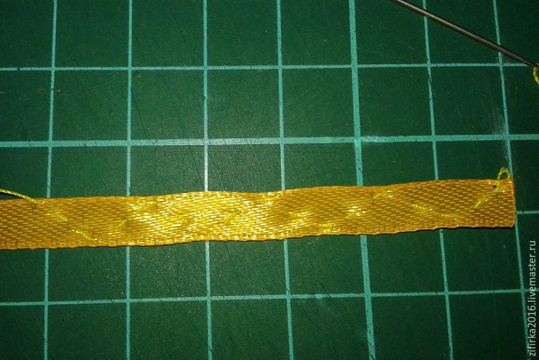 4. Делаем серединку. Для этого берем отрезок желтой ленты длиной 35-37 см. Оплавляем края. Берем нитку в цвет ленты, закрепляем и наметочным швом прошиваем всю ленту, как бы деля ее на треугольники (надеюсь, что объяснила понятно).