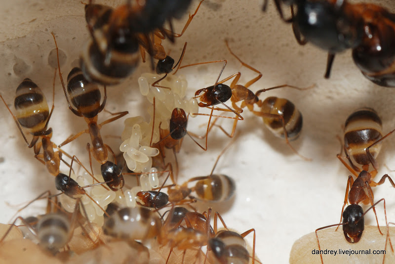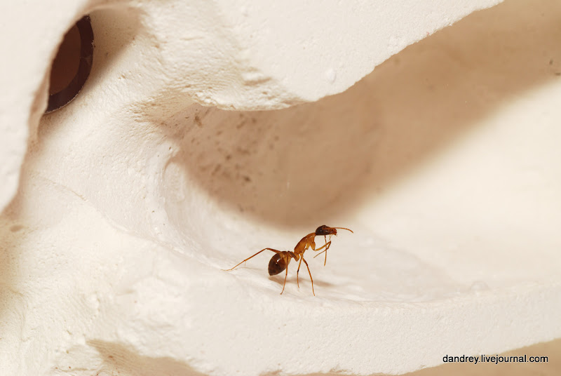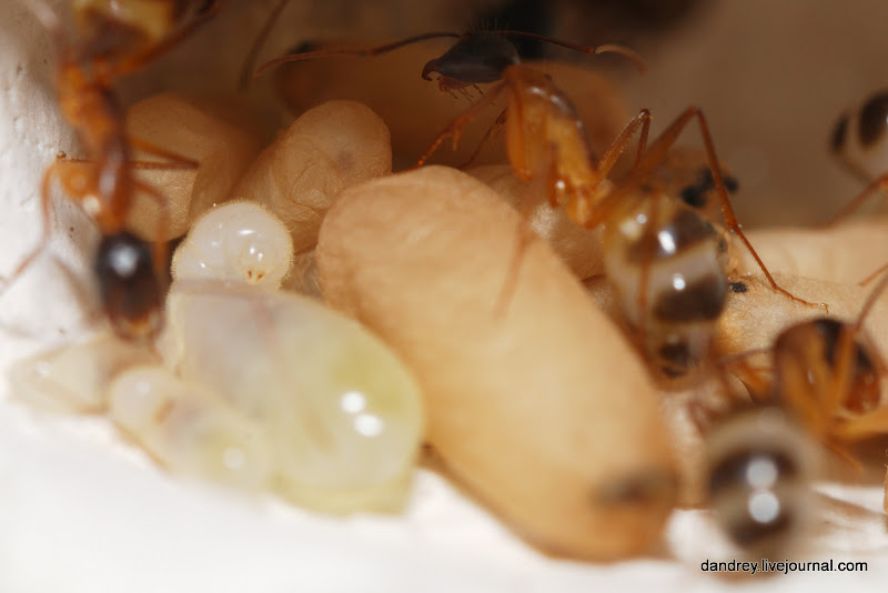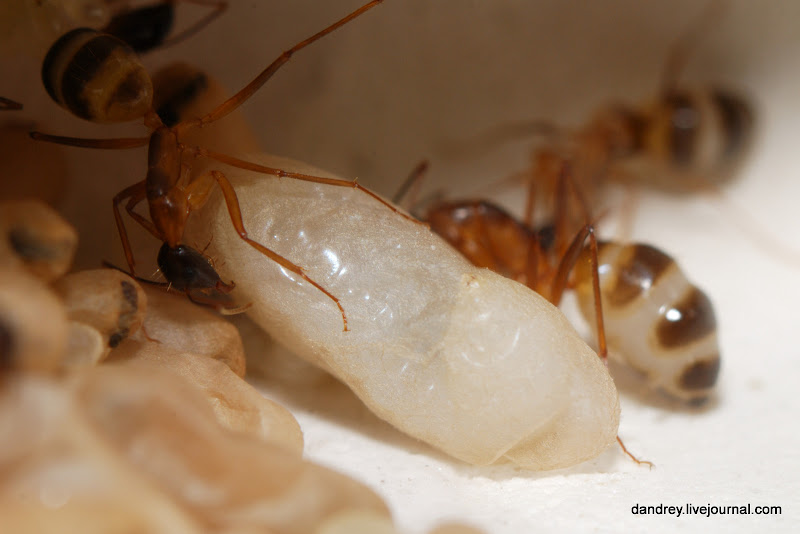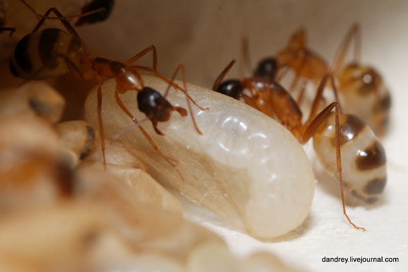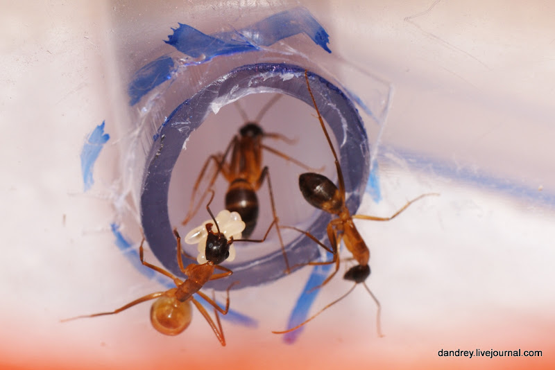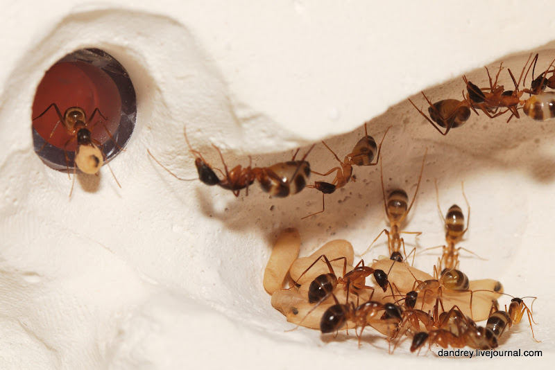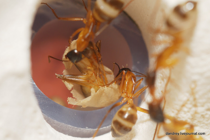 . Через ровное стекло наблюдать и фотографировать муравьёв намного лучше. Наконец-то смог сфотографировать процесс распаковки новорождённого
