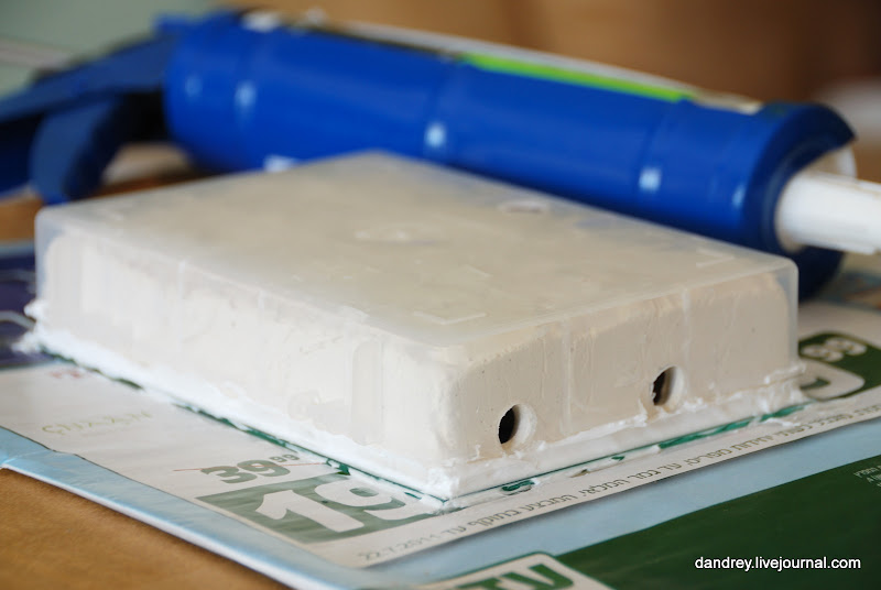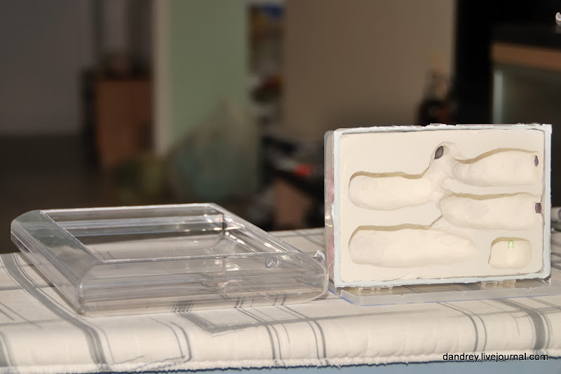 7. Чтобы упростить процесс вынимания отливки из коробки и не допустить вытекание гипса через уже сделанные отверстия, выложил дно коробки пищевой плёнкой. Я предположил залить гипс в коробку и накрыть стеклом с пластилиновой формой выдавив лишний гипс. На самом деле это не самая хорошая идея. По крайней мере у меня не получилось. Правда, опыта работы с гипсом у меня почти ноль. Первый и последний раз я отливал гипсовую форму когда работал полировщиком в стоматполиклинике почти двадцать лет тому назад. Я тогда вырезал из воска черепушку, величиной сантиметров пять, и увековечил её в стоматологическом пластике. Потерял её при переезде, очень жаль