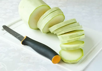 - Вымытые плоды разрежьте на тонкие бруски (если кожица твердая, ее стоит предварительно срезать).