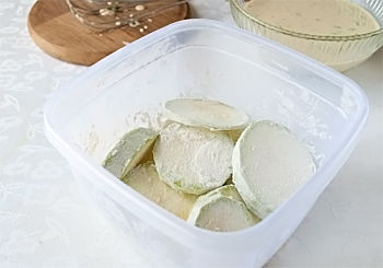 Кружочки кабачка окунаем с двух сторон в кляр, даем стечь избытку теста.