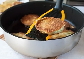 - Кабачковые ломтики нужно обмакнуть в жидкое тесто и обжарить на огне средней интенсивности.