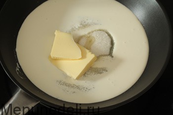 Сахар, сливки и масло помещаем в сковороду с толстым дном на средний огонь.