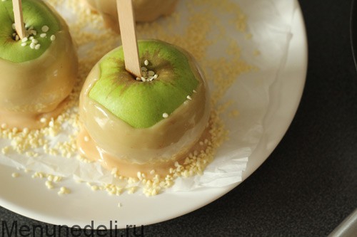 – - Экспериментируйте: можно взять яблоки сорта "Китайка" - это маленькие кисло-сладкие яблочки, размером с орех. У вас получатся чупа-чупсы из яблока и карамели.
