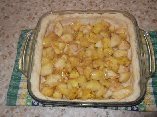 В форму выкладывался хлеб, следующим слоем были готовые яблоки, закрывалось слоем такого же хлеба и запекалось.