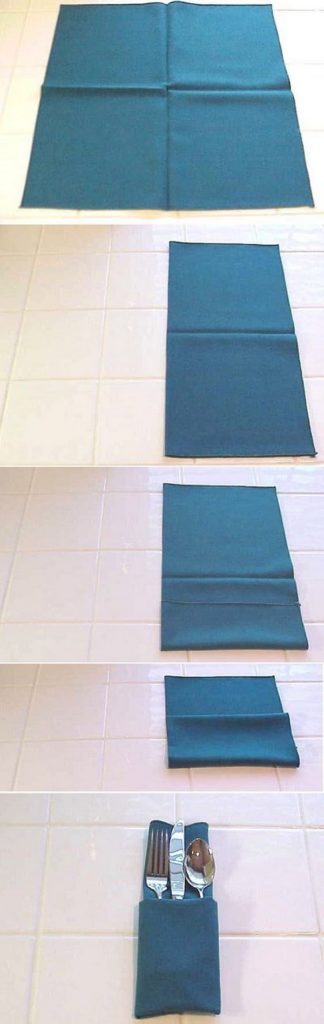 Первоначально салфетка складывается в две лицом внутрь (складывается вниз). Согните одну треть верхнего слоя вниз, образуя складку посередине. Поверните противоположную сторону к себе. Сложите стороны так, чтобы они касались середины. Сложите его снова. А после того, как саше будет готово, в него можно будет сложить вилки, ножики.