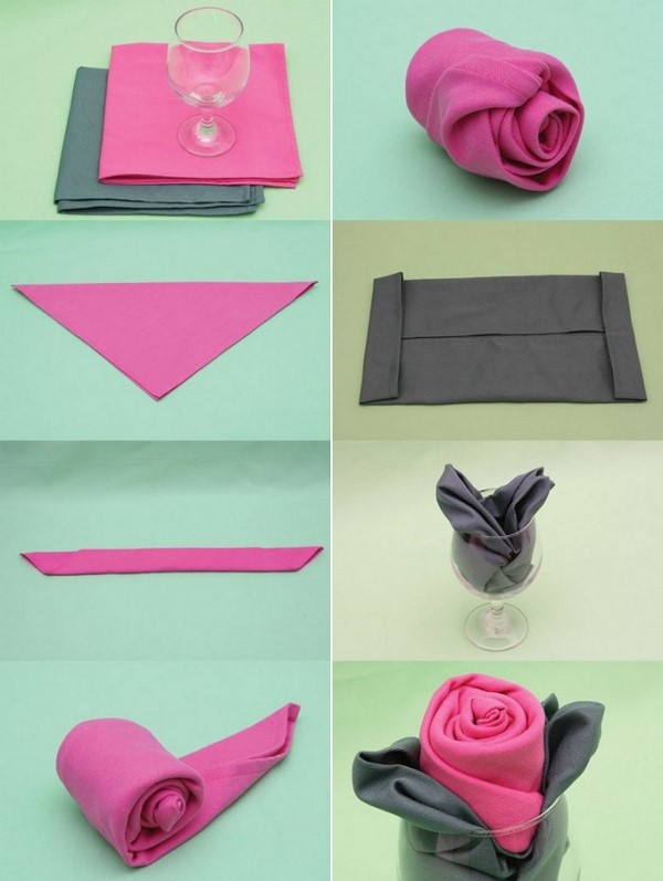 Салфетки кладут не только на тарелку или возле нее, очень красиво смотрится сложенная салфетка в стакане. Вот отличный вариант как сложить салфетку в стакан в виде розочки с пошаговой схемой.
