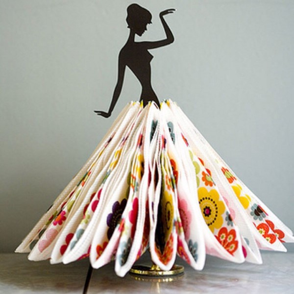 В обычную салфетницу салфетки чаще складывают уголками в виде веера. К счастью сегодня можно найти подставки для салфеток поинтереснее, например, в виде девушки, в которой салфетки послужат юбкой.