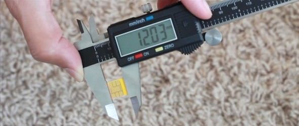 В первую очередь из спецификации nano SIM мы имеем следующие габаритные размеры: ширина: 12,3 мм, длина: 8,8 мм, толщина: 0,67 мм. Для измерений под рукой лучше всего иметь электронный штангельциркуль, потому что обычная линейка в данном случае не подойдет.