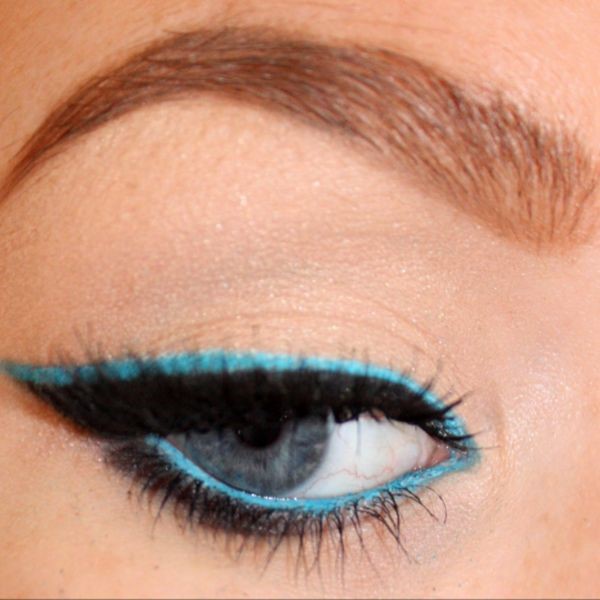 - «Двойные стрелы-колорблок» наносится подводками разных цветов. Чаще толстая основная линия рисуется чёрным или тёмно-коричневым цветом. А другая, тонкая – малиновым, голубым и другим ярким оттенком.