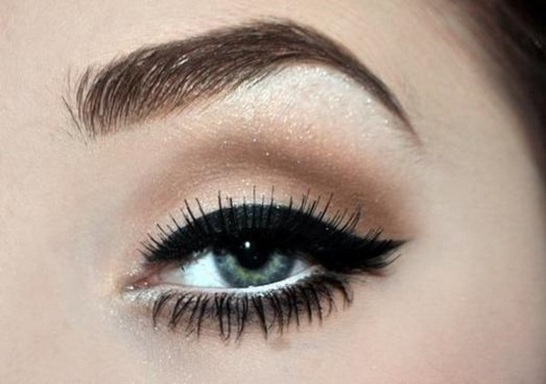 Прорисуйте четкую линию по всей длине века. Посредине стрелку нужно немного сделать толще, а уголки глаз накрасить тенями из светлой палитры.