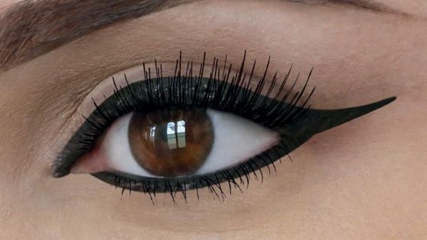 - Изящная и эмоциональная форма «кошачий глаз». Тоненькие линии начинаются от середины верхнего и нижнего века с утолщением к уголку. В углу линии не соединяются, промежуток между ними закрашивается светлыми тенями.