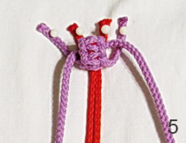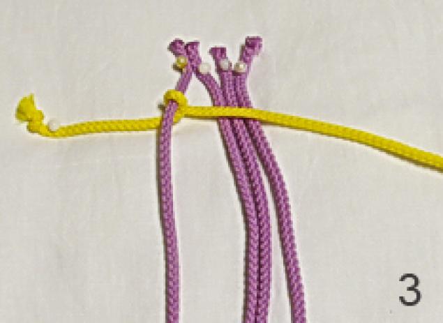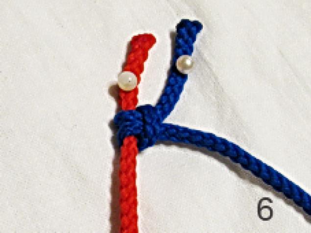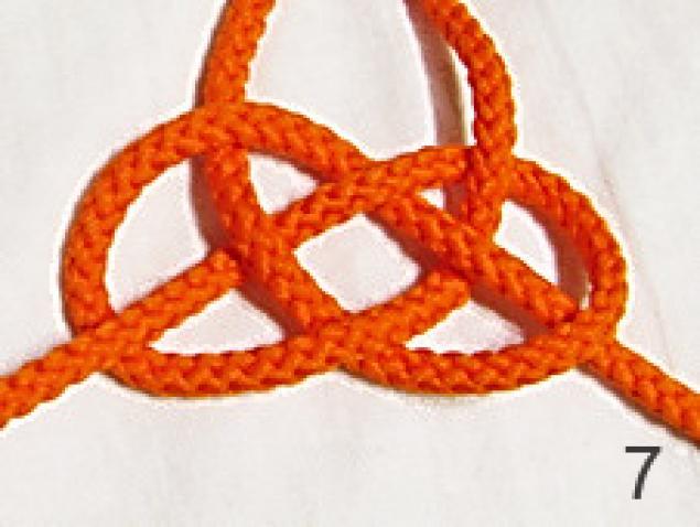 Вторая нить слева — рабочая. В соответствии с фото, мы обвиваем основу двумя петлями и аккуратно по-очереди затягиваем их (рис.3-7). Затягивать лучше не туго — будет неровно, но и не слишком слабо, иначе узел получится рыхлым и некрасивым.