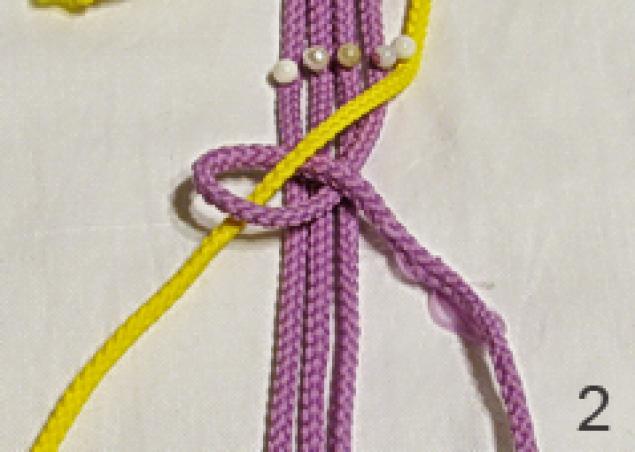 - На среднюю нить нанизайте одну бусину и завяжите нити под ней простым плоским узлом.
