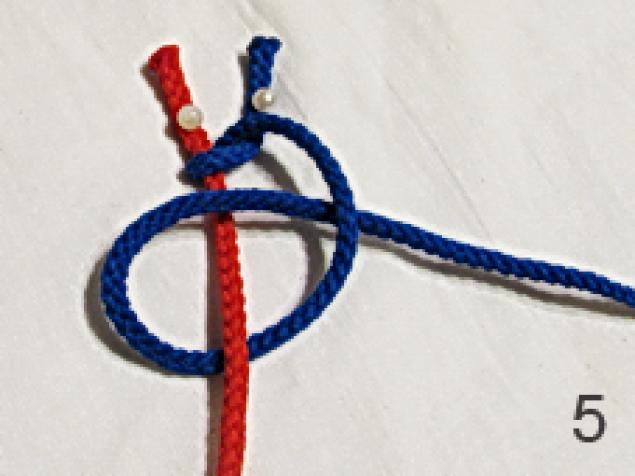 Правый петельный узел выполняется точно так же, как и левый. Единственное различие – это перемена местами рабочей и узелковой нитей. Правая нить – рабочая. Она должна быть длиннее. Левая нить – узелковая, короче правой нити (рис. 5).